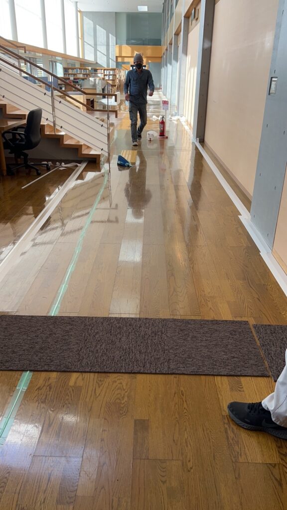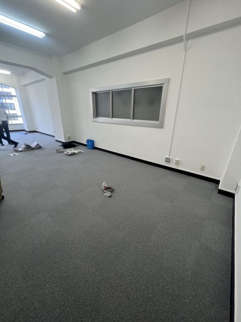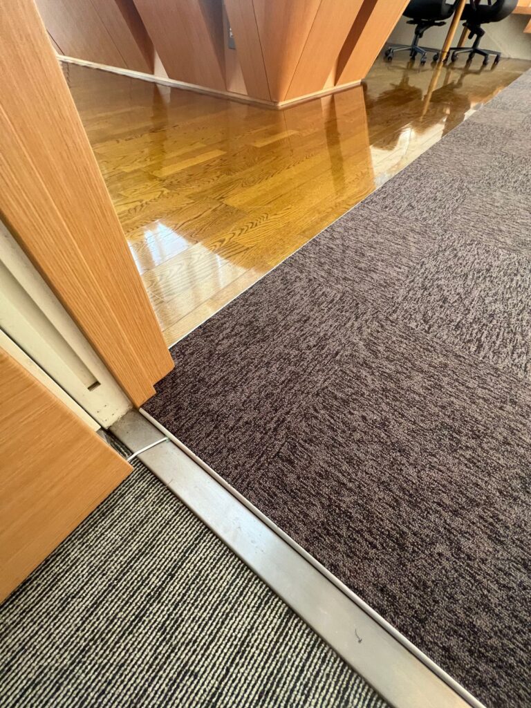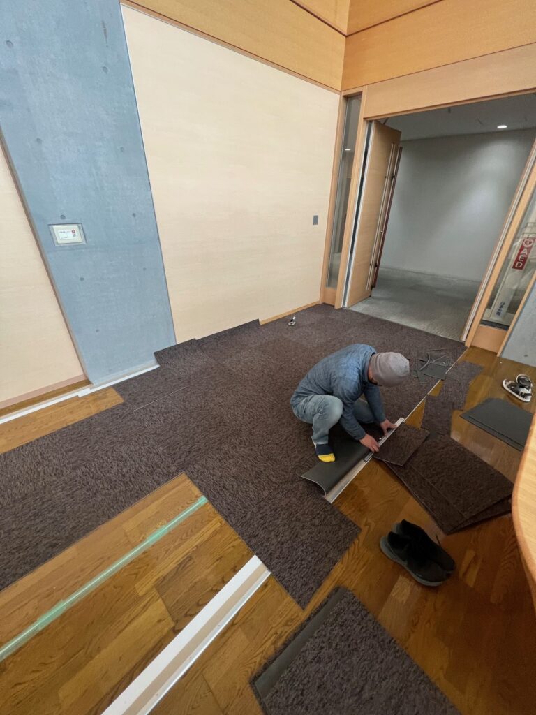 研修生の通り道にタイルカーペットを施工して欲しい。人の出入りが多く、台車が通ることも多いので耐久性のある製品を希望されてました。