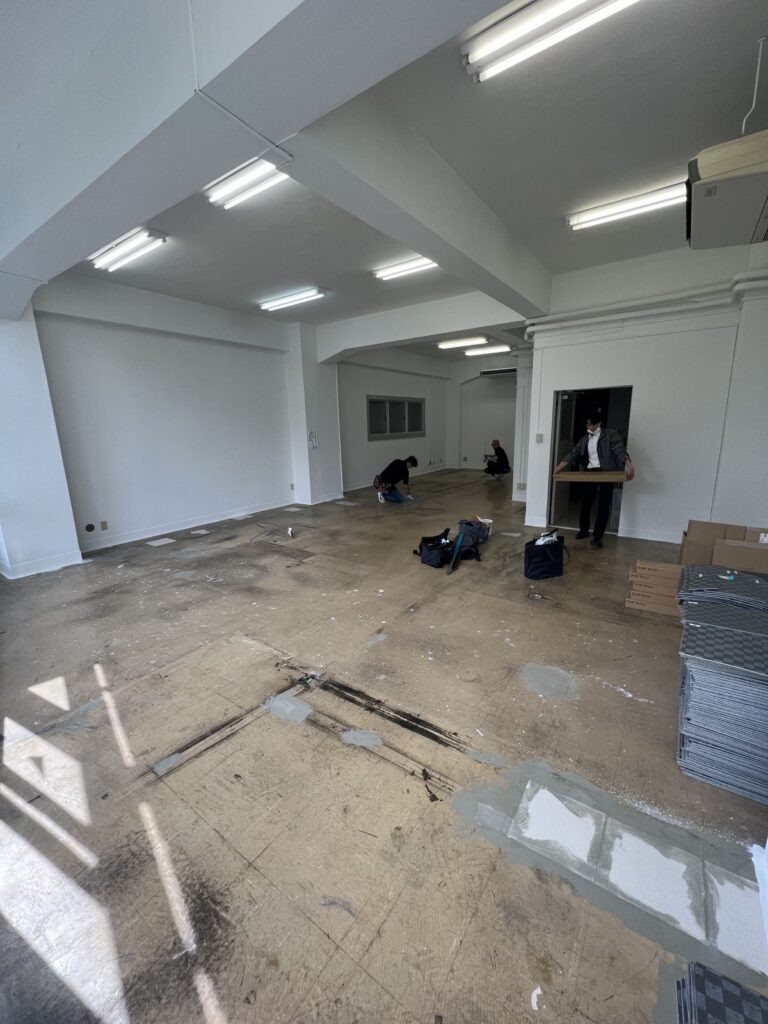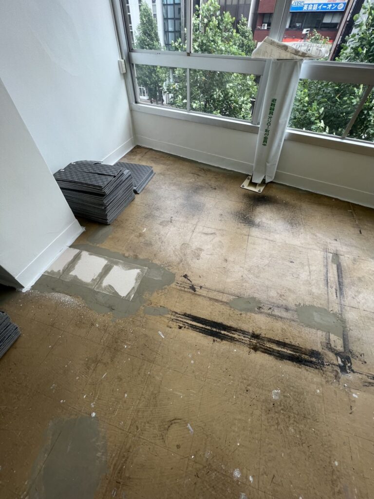 事務所仕様のタイルカーペットを全て剥がして、撮影スタジオとして使えるように大理石調とフローリング調の床に変更して欲しい。